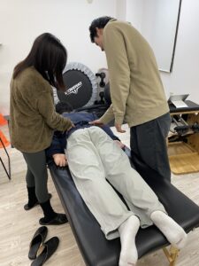 マシンピラティス、マットピラティスでも脊柱を軸にアプローチすることが一般的ですが、当スタジオでは先に手技で触ることにより、身体への認知を高めてから、動いてもらう事で自分の身体をより理解しやすくする事ができると考えています。もちろん、恐怖心があり痛みを取るや減らす為にも実施していますが、それはあくまでもおまけで起これば良いかなと思っています。